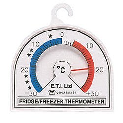 Combined fridge thermometer and freezer thermometer. This fridge or freezer thermometer has a �70mm dial, indicating temperature over a range of -30 to 30�C in 1�C divisions and incorporates colour-coded zones.The fridge freezer thermometer has an ABS case measuring 70 x 60mm. Fridge/freezer thermometer can be free-standing or hung from a shelf.