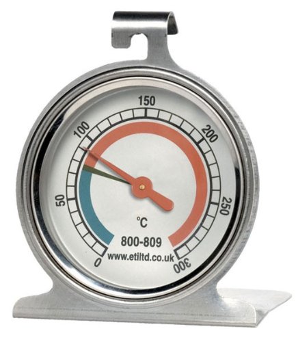 Stainless steel oven thermometer featuring a clear �55mm dial with colour-coded zones. The green markerindicates the minimum temperature that heated display units should be kept at. The thermometer indicates temperature over the range of 30 to 300�C in 10�C divisions. The case measures 45 x 65 x 80mm.The unit can be free-standing or hung from a shelf and should be positioned in the middle of the oven for the most accurate temperature reading.